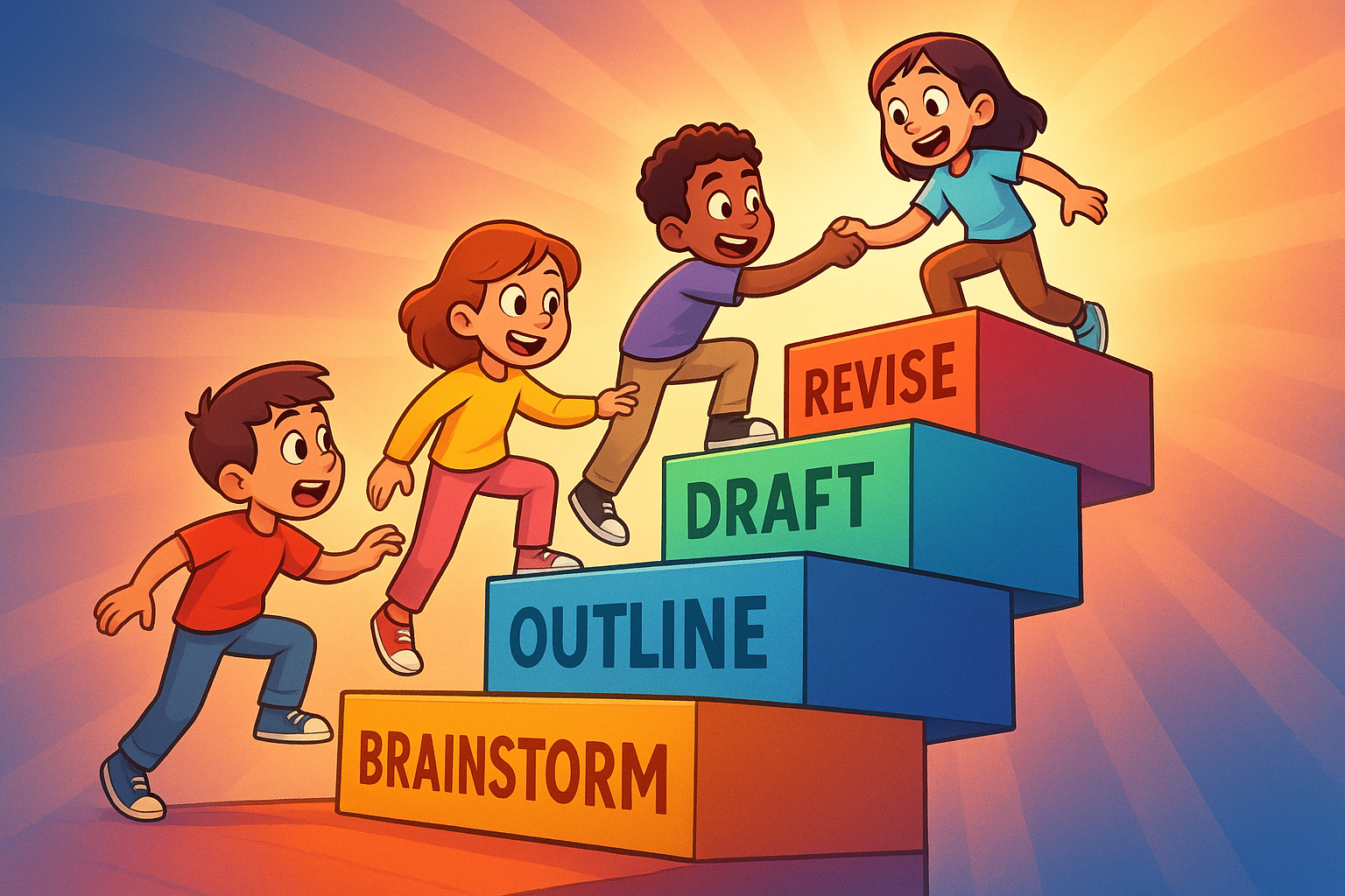 Scaffold each stage: brainstorm with a graphic organizer, outline with prompts, draft with sentence frames, and revise with peer feedback.
