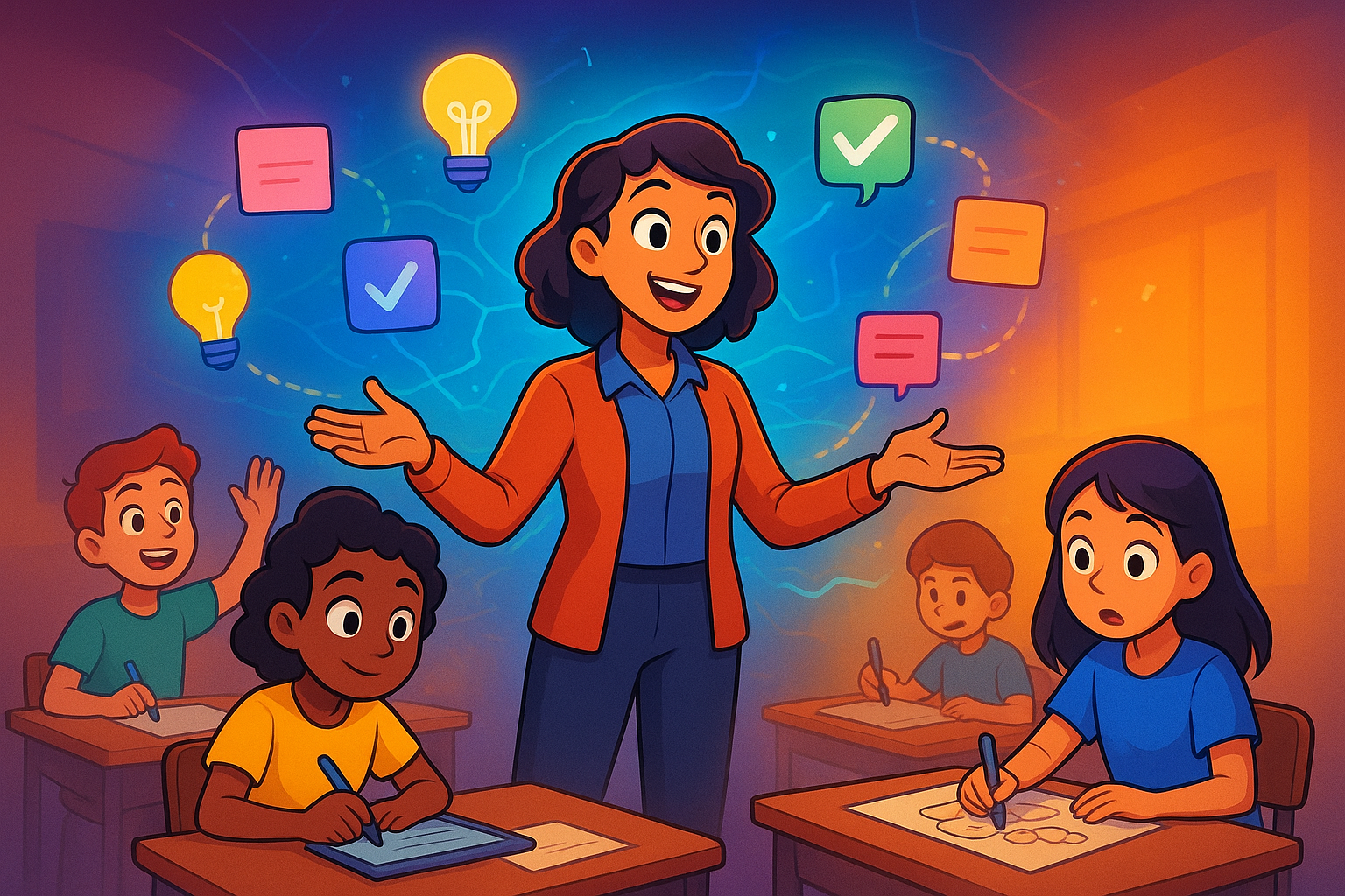 Cartoon illustration of an enthusiastic teacher and two elementary students raising their hands in a brightly lit classroom, with a speech bubble saying Ready to Rock!